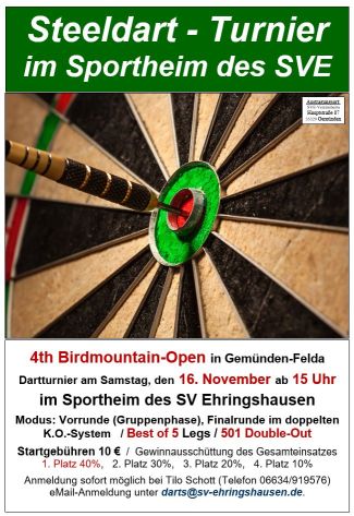 Dartturnier am Samstag, den 16. November ab 15 Uhr im Sportheim des SV Ehringshausen