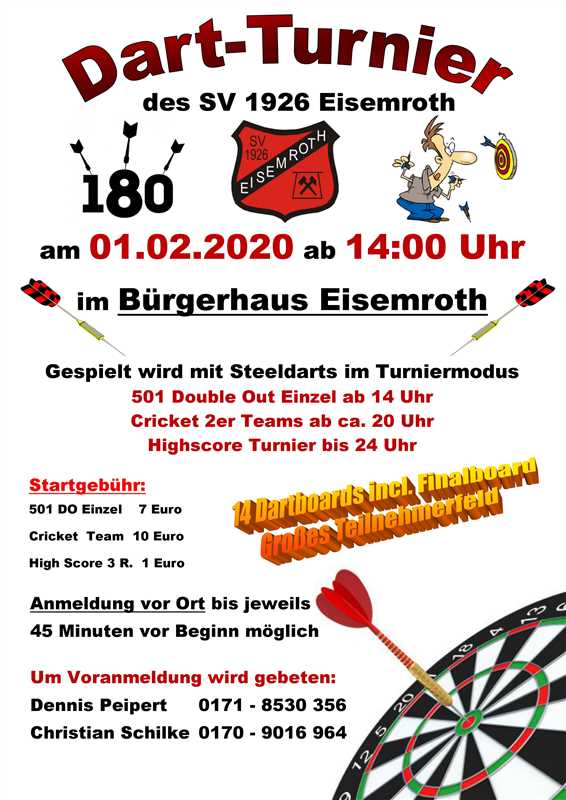 Also kommt am Samtag den 01.02.2020 nach Eisemroth und verbringt ein paar schöne Dartstunden bei uns im Bürgerhaus.