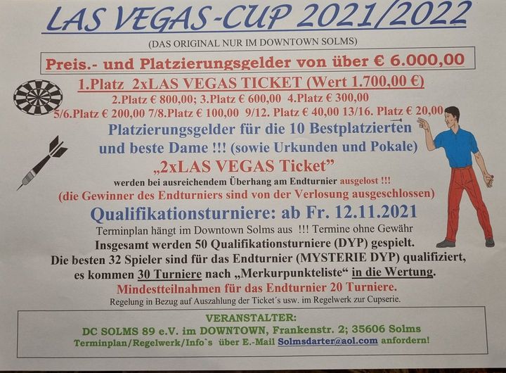 Ihr habt Freitags noch nichts vor und habt lust regelmäßig mit netten Leuten ein wenig in geselliger Runde Dart zu spielen? HEUTE Abend startet die neue Saison des LAS VEGAS Cups mit insgesamt 50 Qualifikationsturnieren und dem anschließend in ~ 1 Jahr folgenden Cupfinale um > 6.000€ Preisgeld.